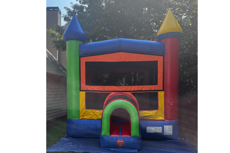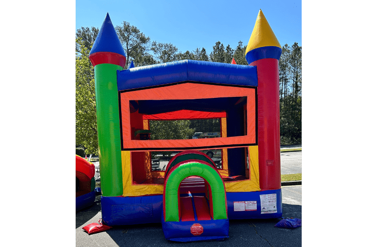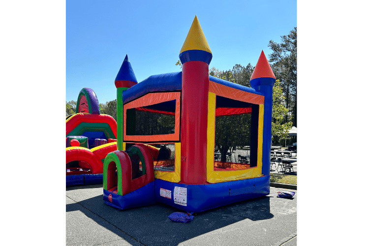 • Majestic Design 🏰: This vibrant, castle-themed bounce house is adorned with brilliant colors and whimsical details, creating an irresistible playground for young royals. 👑
